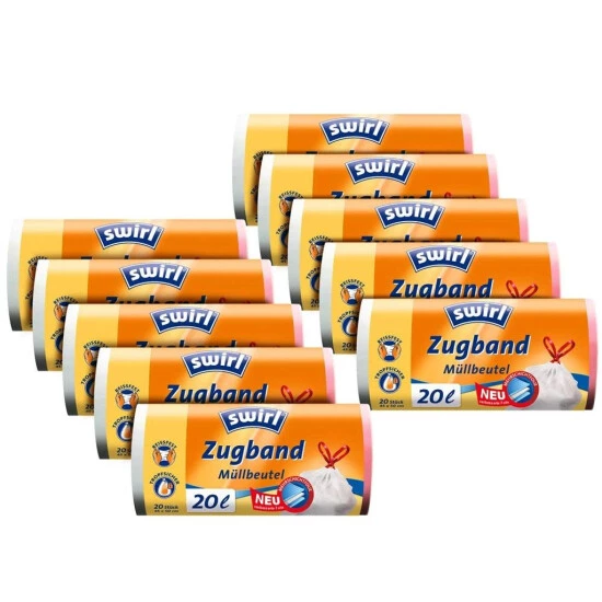 - 200 Müllbeutel a 20 Liter mit Zugband im SET! Auch wenn der Abfall mal etwas schwerer ist – ein gut durchdachter Müllbeutel hält das locker aus. So wie die cleveren Swirl® Zugband Müllbeutel. Fassungsvermögen: je 20 Liter. Packungsinhalt: je 20 Stück. Höhe: je 51 cm. Lieferumfang: 200 Stück auf 10 Rollen.