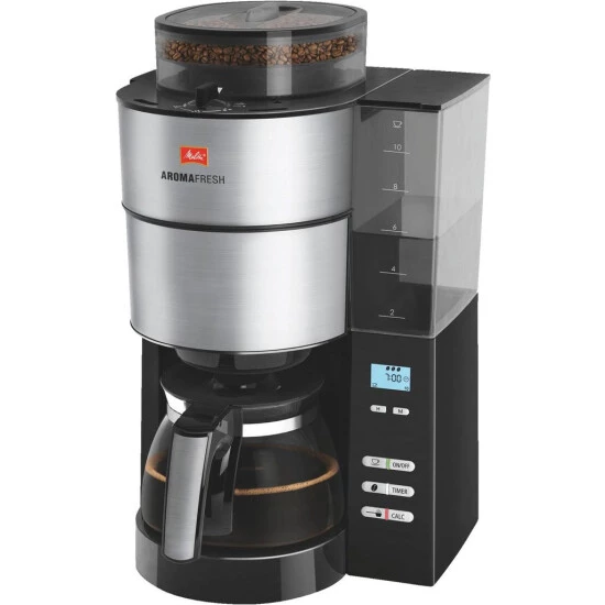 Melitta AromaFresh 1021-01. Bauform: Freistehend, Produkttyp: Filterkaffeemaschine. Fassungsvermögen Wassertank: 1,375 l, Kapazität (in Tassen): 10 Tassen. Behälter für gebrühten Kaffee: Karaffe. Kaffeezubereitungstyp: Manuell. Anzahl der Ausflüsse: 1. Eingebautes Mahlwerk. Display-Typ: LCD. Leistung: 1000 W. Produktfarbe: Schwarz, Edelstahl