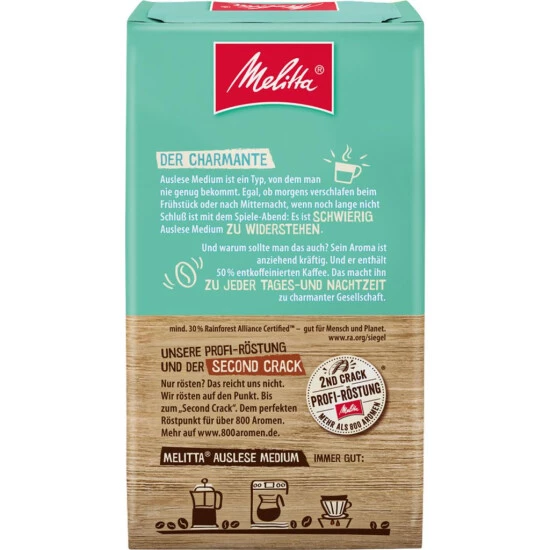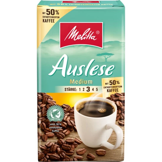 Melitta® Auslese Medium hat ein anziehend kräftiges Aroma und enthält dabei 50% entkoffeinierten Kaffee. Für alle, die volles Kaffeearoma lieben, aber nicht die volle Ladung Koffein haben möchten.