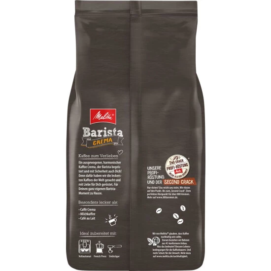 Der Melitta® Barista Crema eignet sich zur Zubereitung von Kaffeespezialitäten im Vollautomaten, aber auch gemahlen für Filterkaffeemaschinen, Handfiltration und French Press. Sein volles Aroma entfaltet er bei einem mittleren Mahlgrad.