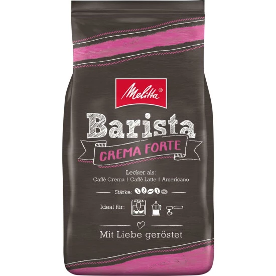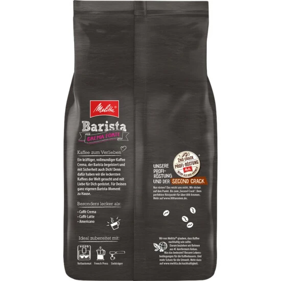 Der Melitta® Barista Crema Forte eignet sich zur Zubereitung von Kaffeespezialitäten im Vollautomaten, aber auch gemahlen für Filterkaffeemaschinen, Handfiltration und French Press. Sein volles Aroma entfaltet er bei einem mittleren Mahlgrad.