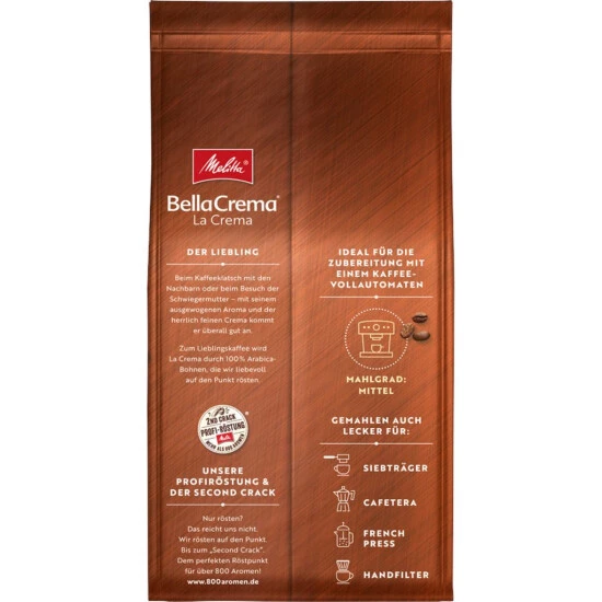 Der Melitta® BellaCrema® LaCrema eignet sich zur Zubereitung von Kaffeespezialitäten im Vollautomaten, aber gemahlen auch für Handfiltration, Siebträger und French Press. Sein volles Aroma entfaltet er bei einem mittleren Mahlgrad.