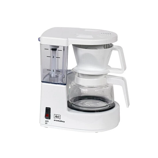 Hersteller: Melitta SDABezeichnung: Kaffeeautomat Aromaboy IITyp: 1015-01 wsAusführung: KaffeeautomatAnschlusswert: 500 WTassenzahl: 2Ausführung der Kanne: GlaskanneGrundfarbe: weißIntegriertes Mahlwerk: neinWarmhalteplatte: jaAromaschalter: neinTimer: neinNachtropfsperre: neinMit Wasserfilter: neinTeefilter: neinWassertank abnehmbar: neinMilchaufschäumung: neinAutomatische Abschaltung: ja