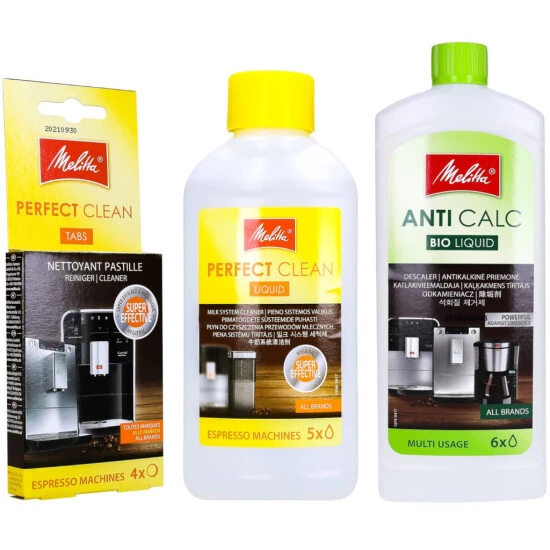 Das Set enthält: Perfect Clean Flüssigreiniger 250ml, AnticalcFlüssigentkalker 250ml, Perfect Clean Tabs 4×1,8g Reinigungstabletten.
