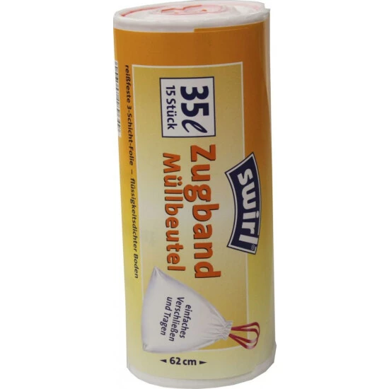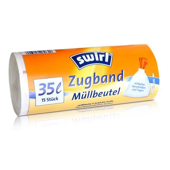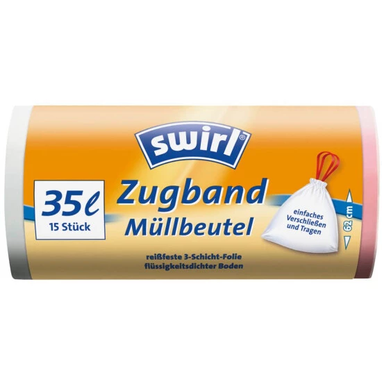 Die Müllbeutel von Swirl werden im 15-er Pack geliefert. Sie haben ein praktisches Zugband für eine bessere Handhabung und fassen ca. 35 l Volumen.