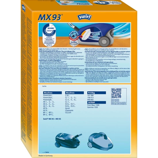 Swirl MX 93. Produktfarbe: Blau, Weiß, Gelb. Anzahl Staubbeutel: 4 Stück(e), Anzahl Filter: 1 Stück(e)