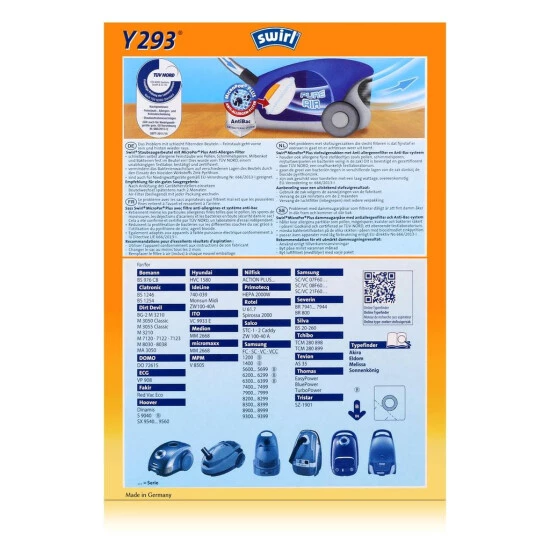 1x Swirl Staubsaugerbeutel Y293 mit je 4 Beutel + je 1 Filter